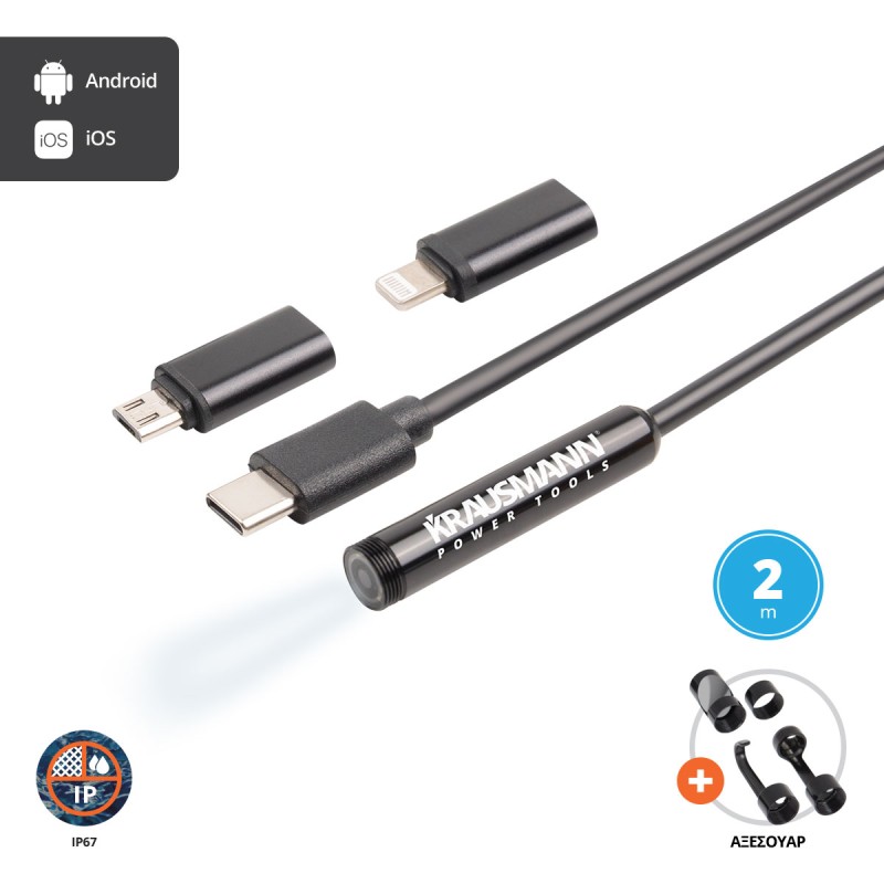 Ενδοσκοπική κάμερα η οποία διαθέτει 6 ρυθμιζόμενα LED και δυνατότητα λήψης φωτογραφίας και βίντεο σε πραγματική μετάδοση. Είναι αδιάβροχη και μπορεί να συνδεθεί σε κινητό, τάμπλετ ή ηλεκτρονικό υπολογιστή μέσω καλωδίου USB. Ένα χρήσιμο εργαλείο εντοπισμού προβλημάτων που δεν πρέπει να λείπει σπό κανέναν επαγγελματία.